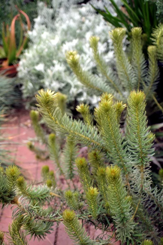 This tender South African perennial has a very tidy, evergreen presentation of tall wiry stems with stiff, deep green, small, myrtle-like leaves.