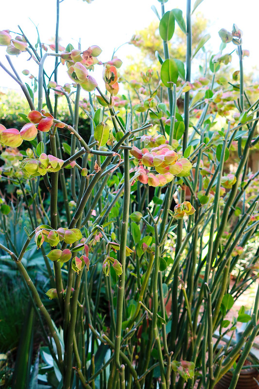 The sonchus are budding up, and there’s no question that a giant dandelion will be the life of the party when in bloom. It’s become a regular presence through the years, robustly reseeding despite most references suggesting Sonchus palmensis does not reseed — wtf? Geranium maderense also reseeds luxuriantly, thinned to five plants that should bloom maybe by March. (Being biennial, I think this year it should cycle into flower but no guaranties.) Seedling poppies and orlaya are entrenched in the garden too for early summer, a show I mostly miss but know by their ghostly skeletons I pull out in fall. And the tall pencil plant, Pedilanthus bracteatus, is another year-round source of nectar for hummingbirds. When I’m home, I see these guys every day and can’t help but feel responsible for them!