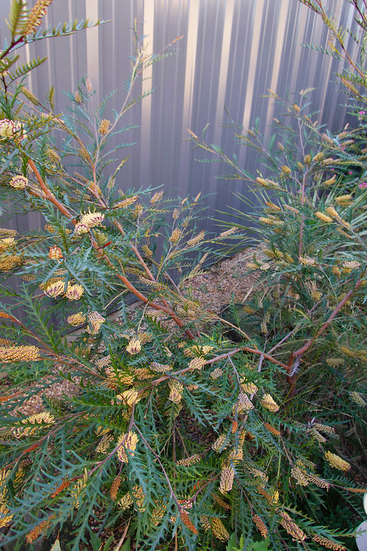 Not all grevilleas have proven as resilient as ‘Moonlight.’ To be fair, ‘Poorinda Blondie’ was newly planted in November 2020, and I left the garden on its own October 2021. By October 2024, ‘Poorinda Blondie’ had collapsed.
