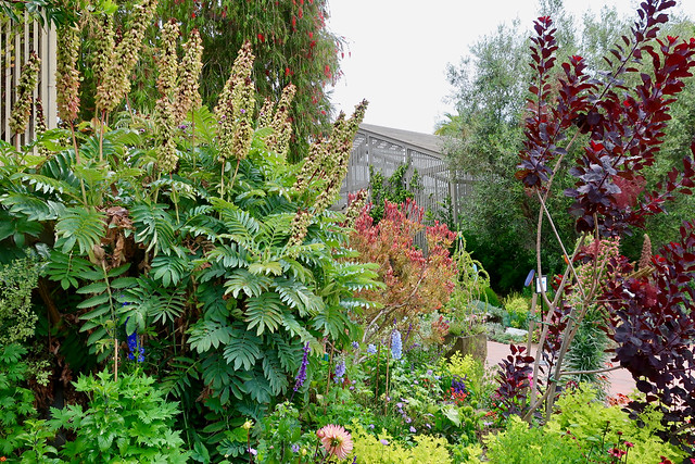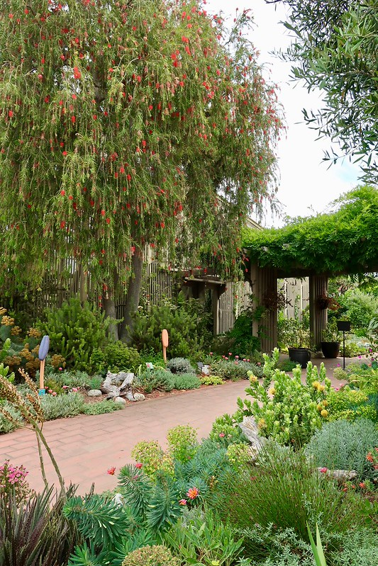With the heat wave mostly over, yesterday I drove south to Newport Beach for some garden time. Bathed in the cool coastal conditions at the Pacific Ocean, the Sherman Gardens & Library are a genteel lunch and garden destination that always has something worth looking at. The succulent and cactus garden, for instance. The first clue that this was not going to be a relaxing wander through the lath houses and brick pathways was the free admission. Didn’t I used to have to pay to get in? The entrance had been changed as well. The newly improvised entrance led straight into the succulent garden.
